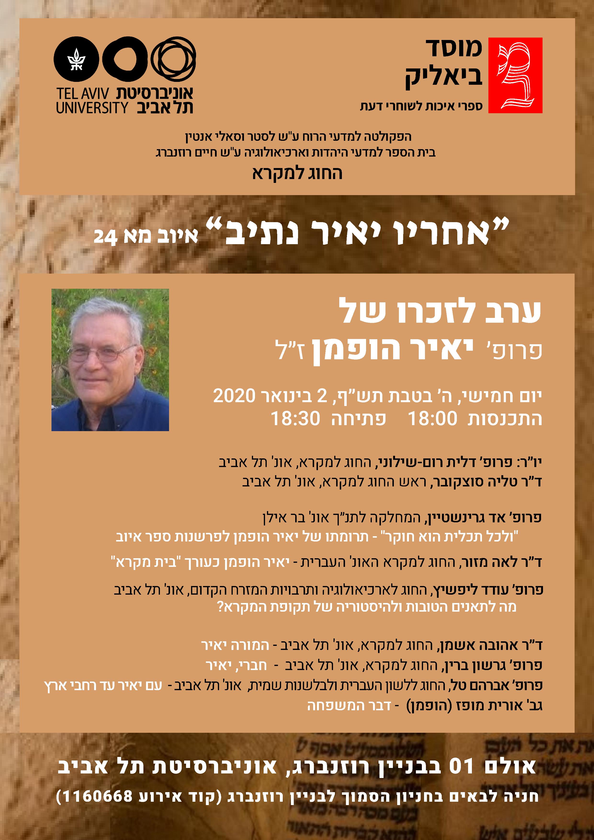 > החוג למקרא מקיים ערב עיון לזכרו של פרופ' יאיר הופמן ז"ל - "אחריו יאיר נתיב" איוב מא 24
